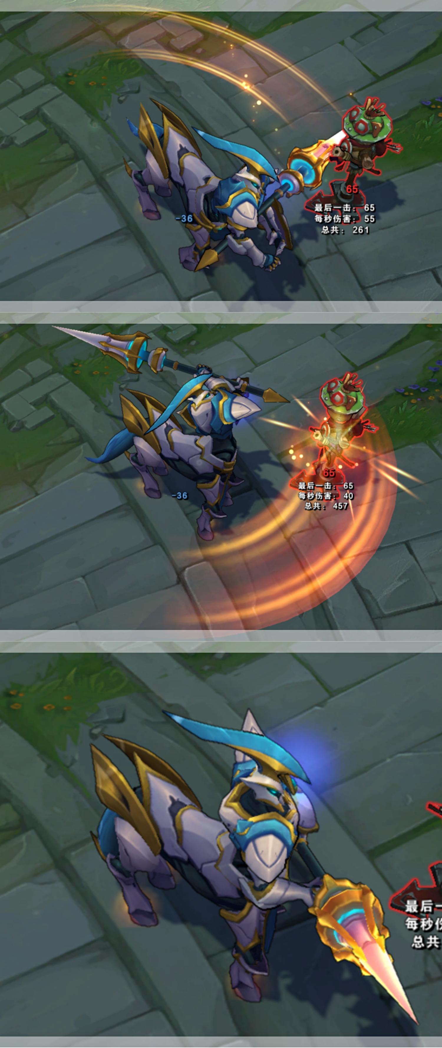 【平A】:持盾的左手向前做挥砍动作,比较遗憾没有做出那种骑兵特有的拿枪捅/刺的动作,还是用原皮肤的挥砍动作实在违和。
