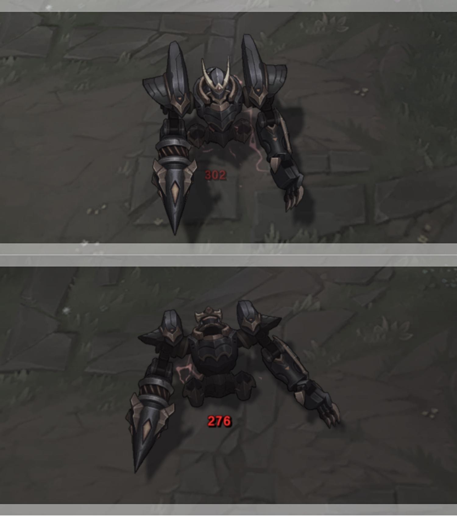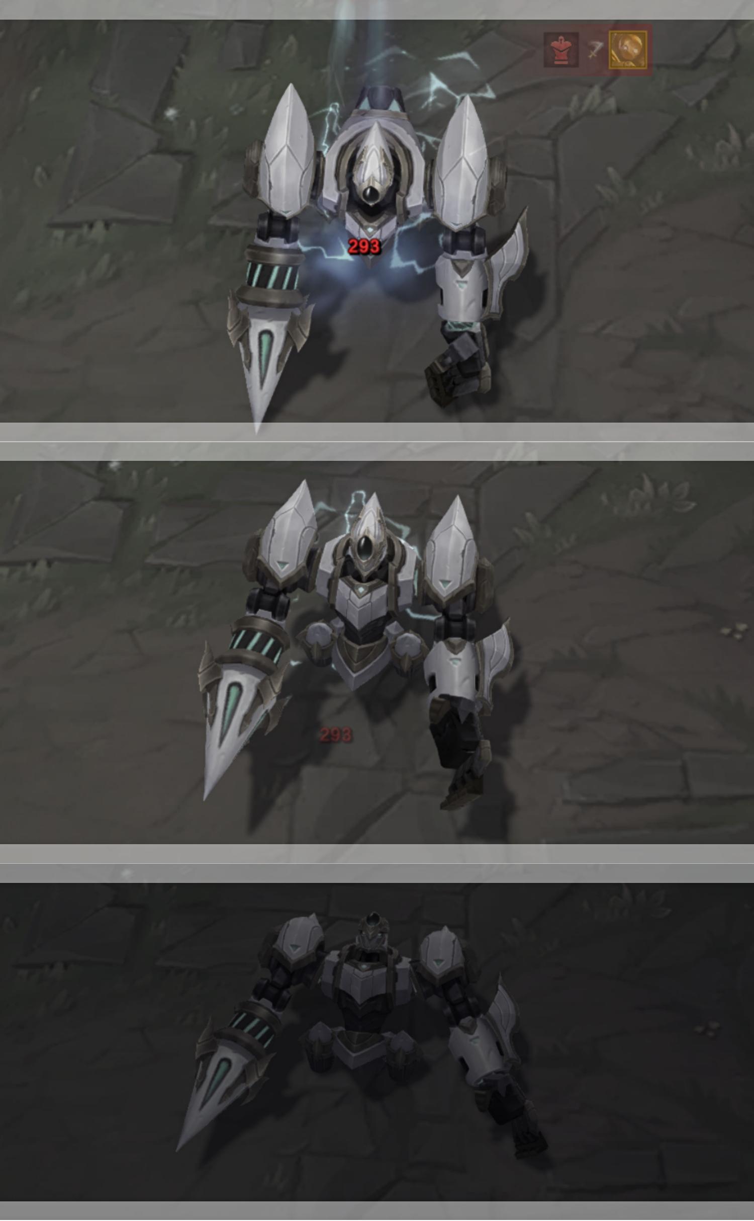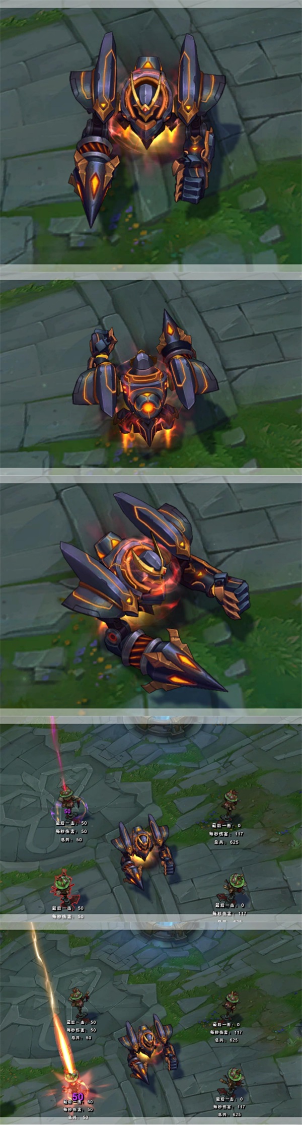 【R被动】:升级R技能后,身体就会被一层棕色电光护体保护。而且身上缝隙(水口)这时也会点亮为棕色。表现出能量过载的现象,这两种颜色的搭配比银白来得更显霸气和威严,肃杀感十足
