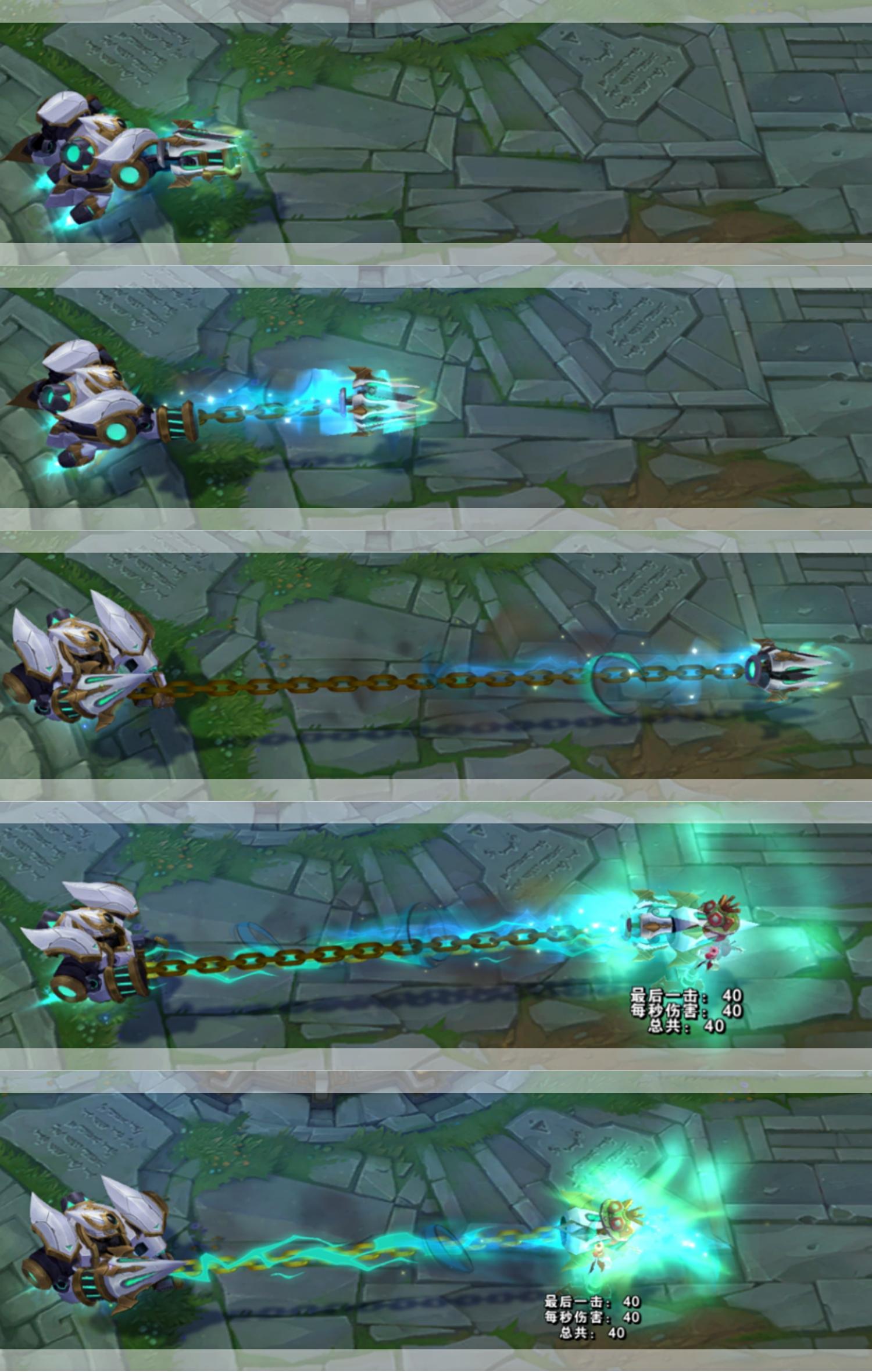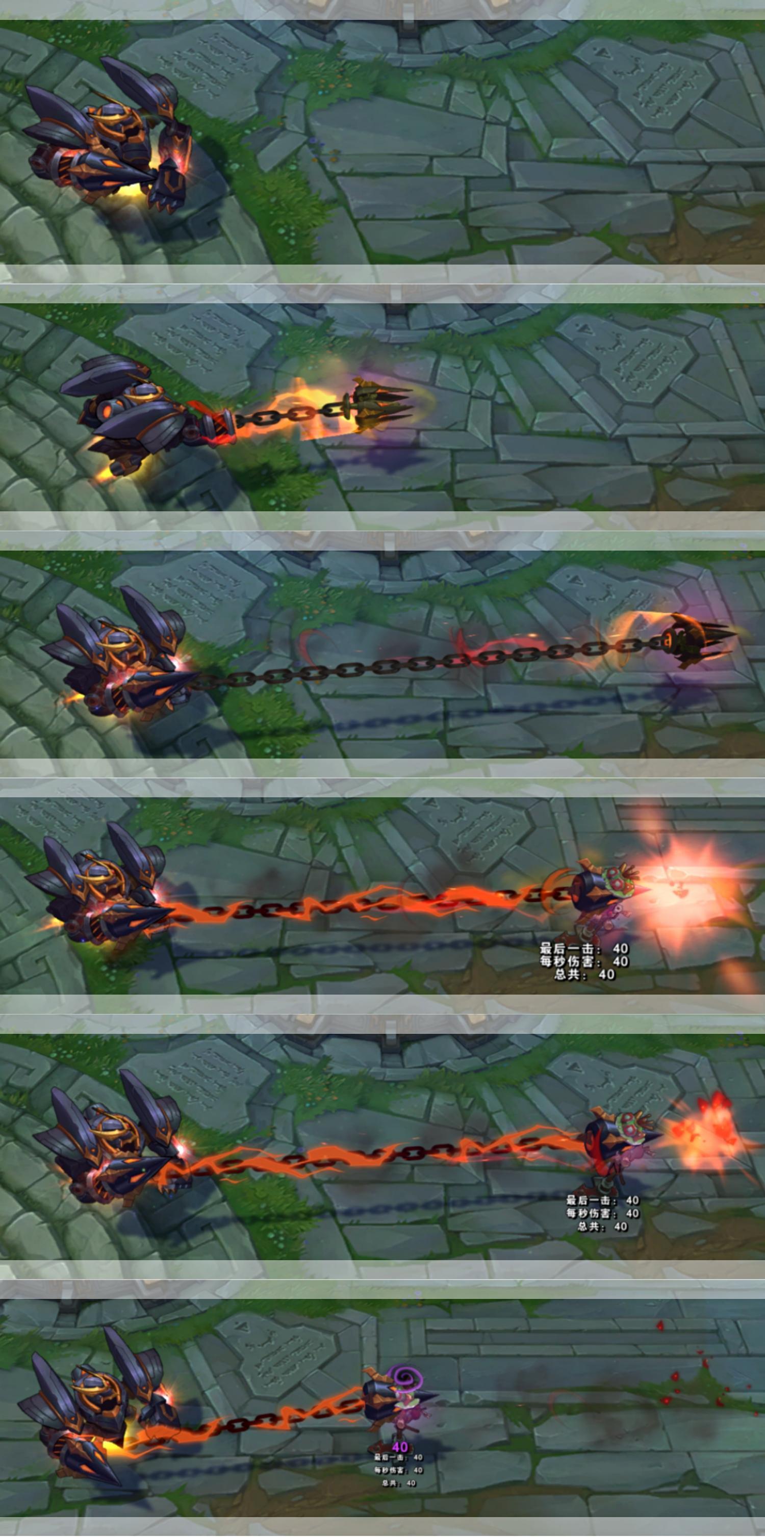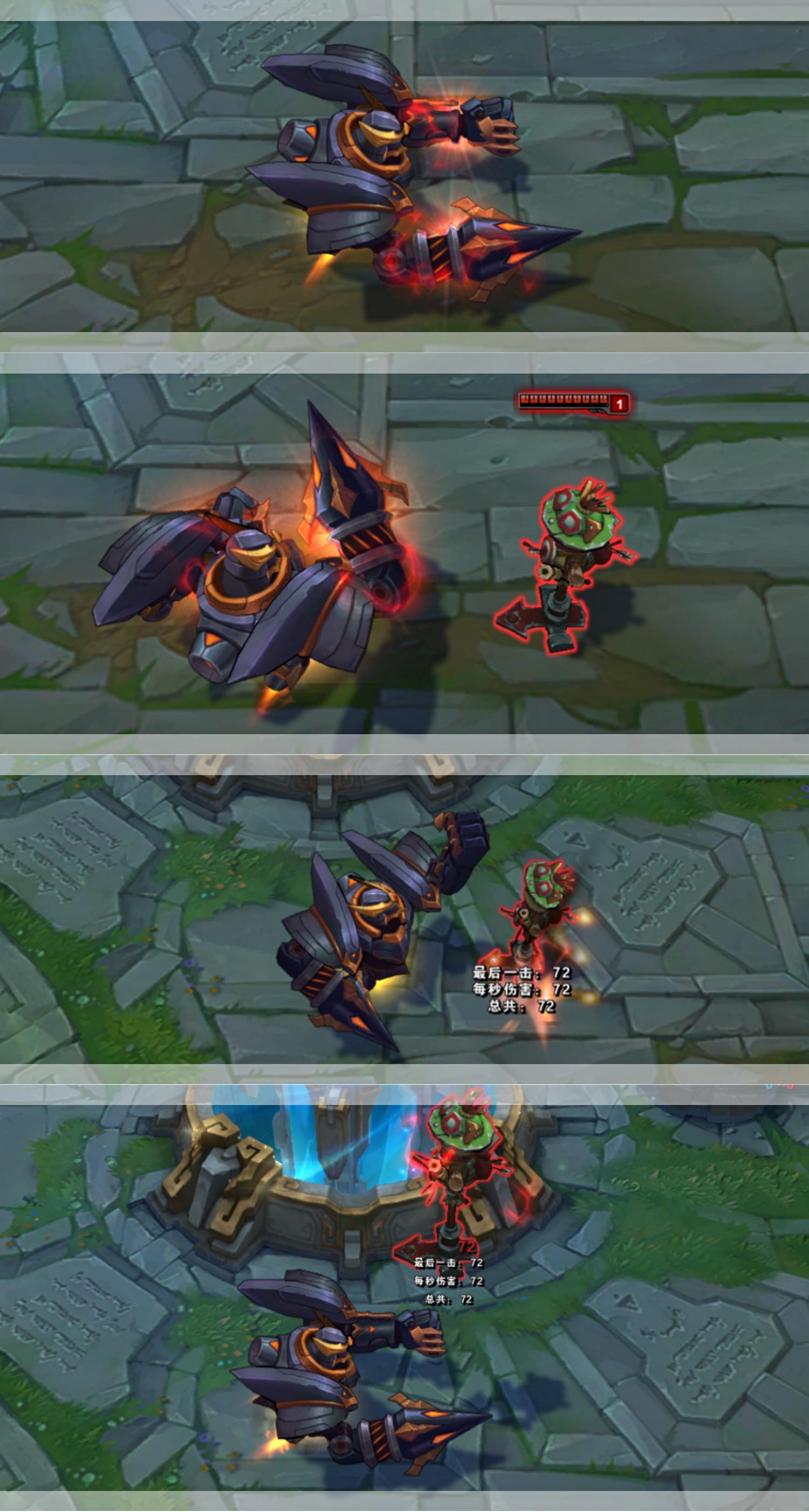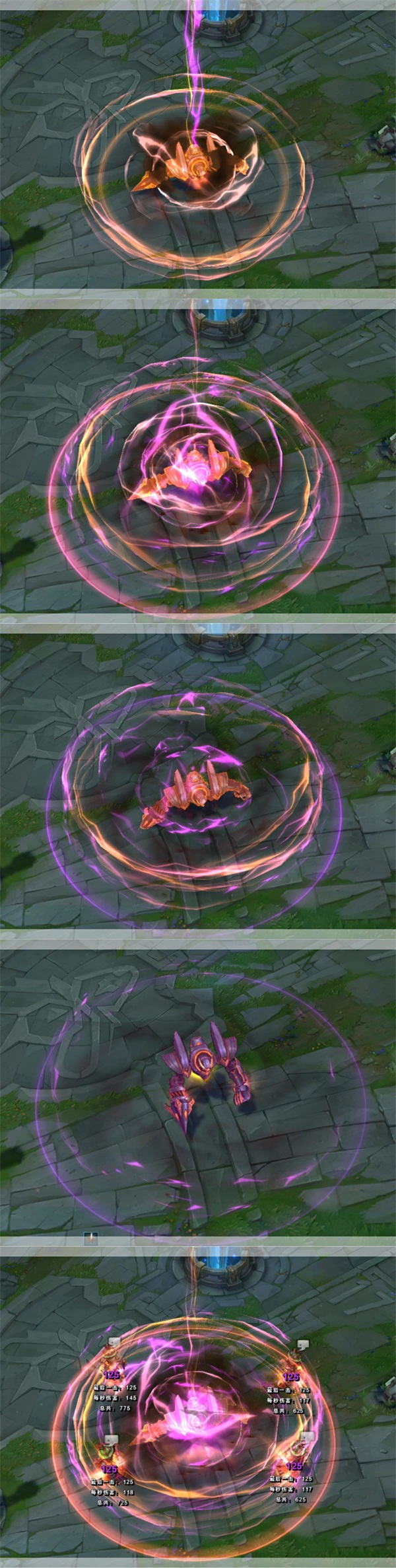 【W】:W技能开启,移动的途中,带钩子那只手会加速旋转,到最高转速时会出现电光。这款皮肤加速后的尾焰玫红色的,非常漂亮