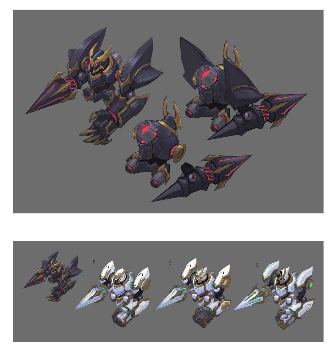 零之枪骑 布里茨是 ”一款“基于科幻、恐怖或者幻想的皮肤。布里兹这款皮肤面世之前已经好一段时间没有比较正经的皮肤了。所以设计师尽可能多地绘制符合以上类型的铁钩概念图。