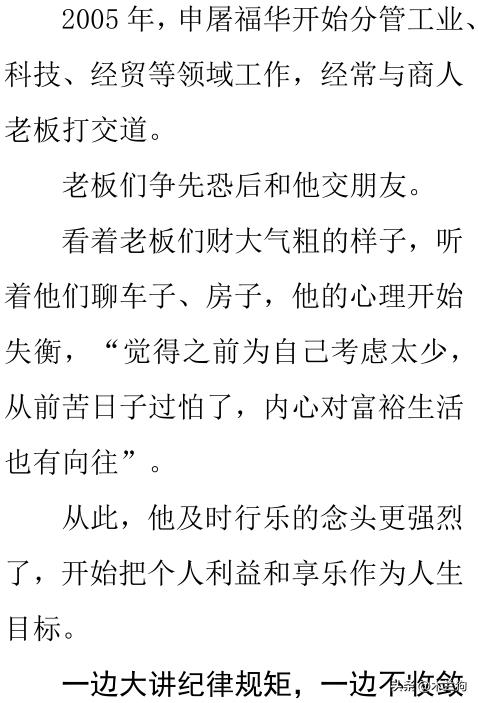 随着申屠福华职务的一步一步升迁,他交往的人员层次也越来越高,他接触的有钱的企业老板和商人越来越多。在与这些企业老板和商人的交往过程中,申屠福华发现自己的穿着、车辆、住房等方面与这些企业老板和商人的差距很大,感觉自己有点寒酸,他的心态开始发生变化,感到非常的不平衡,他开始觉着应该用自己手中的职权为自己做点什么。