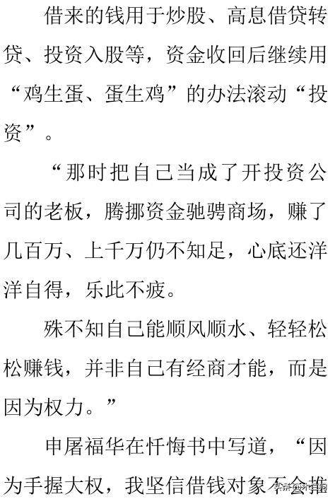 申屠福华开始利用自己手中的职权,为自己谋取利益,大肆收受企业老板和商人的财物,低价购买各种房产和别墅,到企业投资入股,通过企业去进行高息借贷。