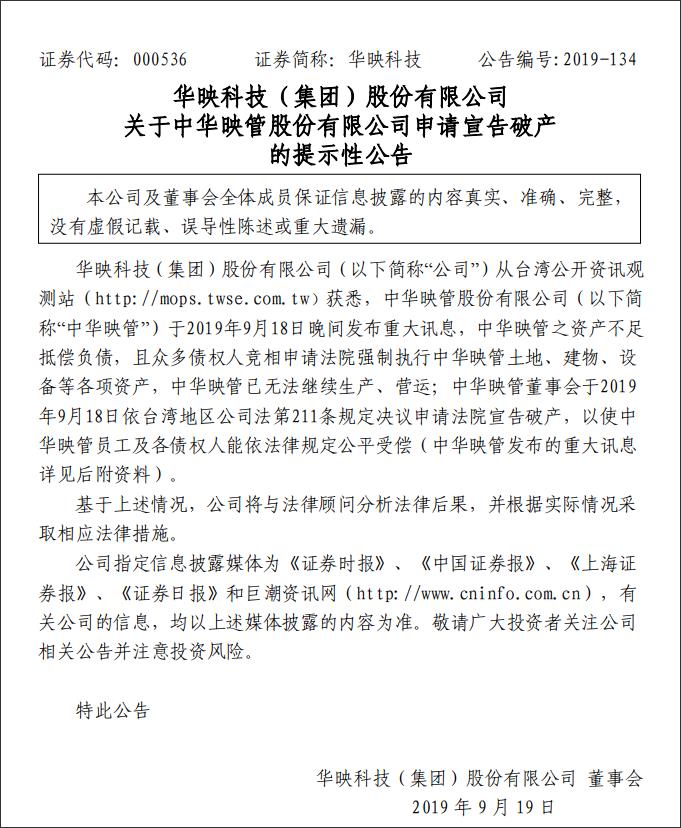 华映科技(000536)9月19日早间发布公告称,公司获悉中华映管于9月18日晚间发布重大消息,中华映管资产不足以抵偿负债,且众多债权人竞相申请法院强制执行中华映管的土地、建物、设备等各项资产,中华映管已无法继续生产、营运。中华映管董事会于9月18日申请法院宣告破产,以使中华映管员工及各债权人能依法律规定公平受偿。