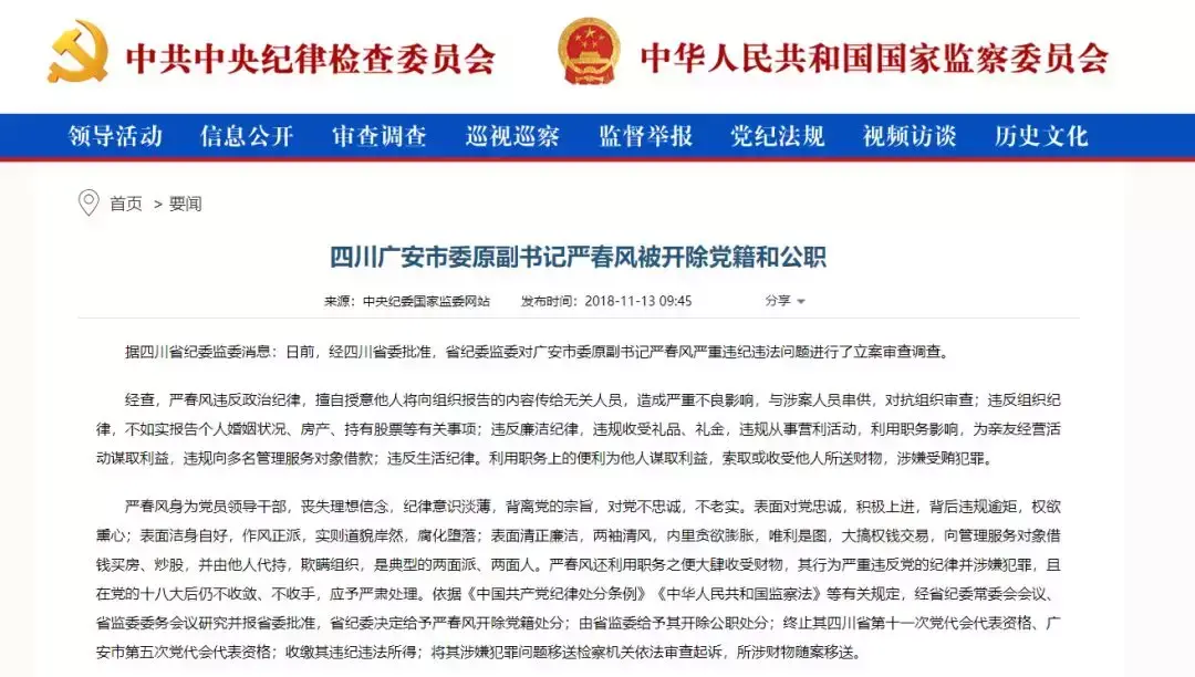 中央纪委国家监委网站和四川省纪委监委网站同时发布:广安市委副书记严春风涉嫌严重违纪违法,目前正接受纪律审查和监察调查。