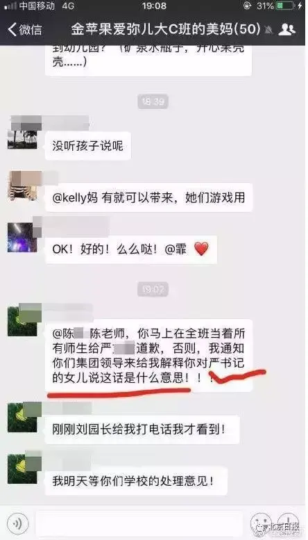 微博上广泛流传的一组微信群聊截图显示,幼师陈某在微信群内吐槽,引起了学生严某某妈妈的不满。群内署名为“严某某妈妈”的人士发言称,“陈老师,你马上在全班当着所有师生给严某某道歉,否则,我通知你们集团领导来给我解释你对严书记的女儿说这话是什么意思!”