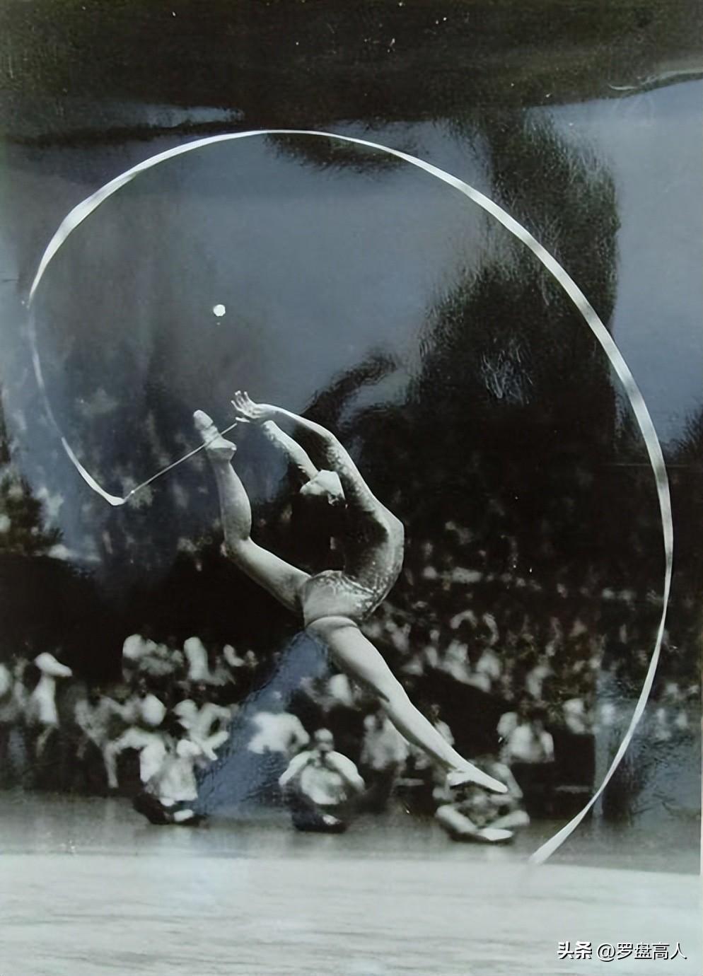 1980年,北京体育学院艺术体操班,女大学生在表演民族彩带操景象