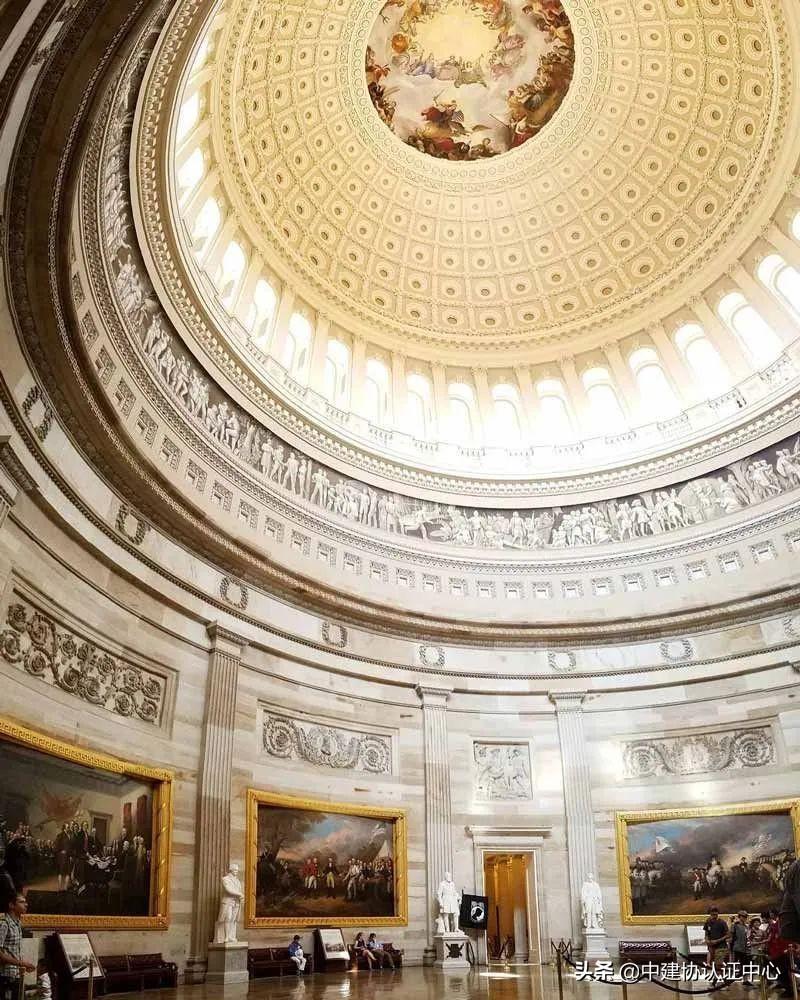 (5)大厦内部装饰严肃雄伟。大厅正门向东,绘有哥伦布发现新大陆的浮雕。再往里走,圆形大厅内部空间宽敞明亮,金碧辉煌,墙面挂着巨大的油画,展现了美国的发展史。圆穹顶上的“华盛顿之神”等壁画,让大厦的内部宏伟庄重,彰显了历史的厚重感。