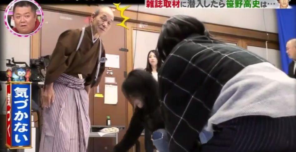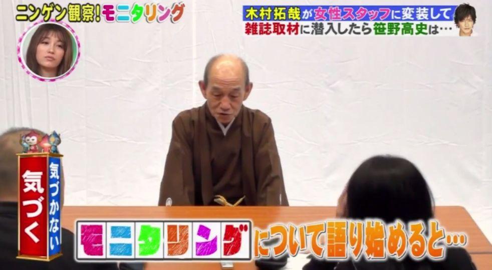 这次要恶搞的是与木村拓哉有过共演经历的70岁老戏骨笹野高史先生,给他安排了一个假的采访,木村拓哉作为工作人员出现。