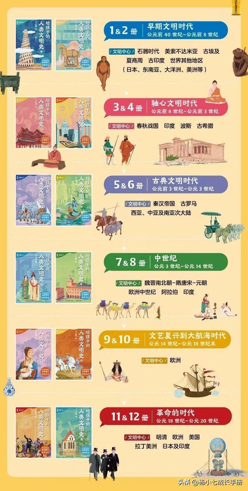 我感觉这不仅仅是给孩子的一套文明史,成年人也可以用来做世界通史入门,低龄孩子读它可以进行历史启蒙,高年级孩子读它可以进行课外拓展。7-18岁想看历史书籍的孩子,真的推荐这套集中国史、世界史、全球文明史于一体的《给孩子的人类文明史》。