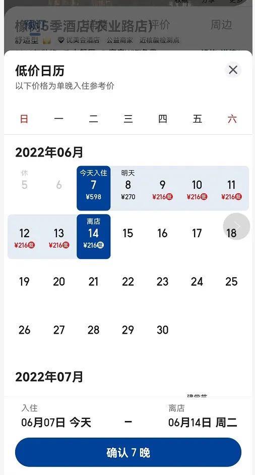“我们这边很多房型早就订完了,现在只剩下几间商务房和大床房了。”某舒适型酒店的工作人员告诉记者,“现在最低的价格是598元一间,数量有限。”记者查询了低价日历,发现该酒店6月7日最低价格在598元一晚,6月8日恢复到270元,6月9日降到了216元,考前考后价差近3倍。