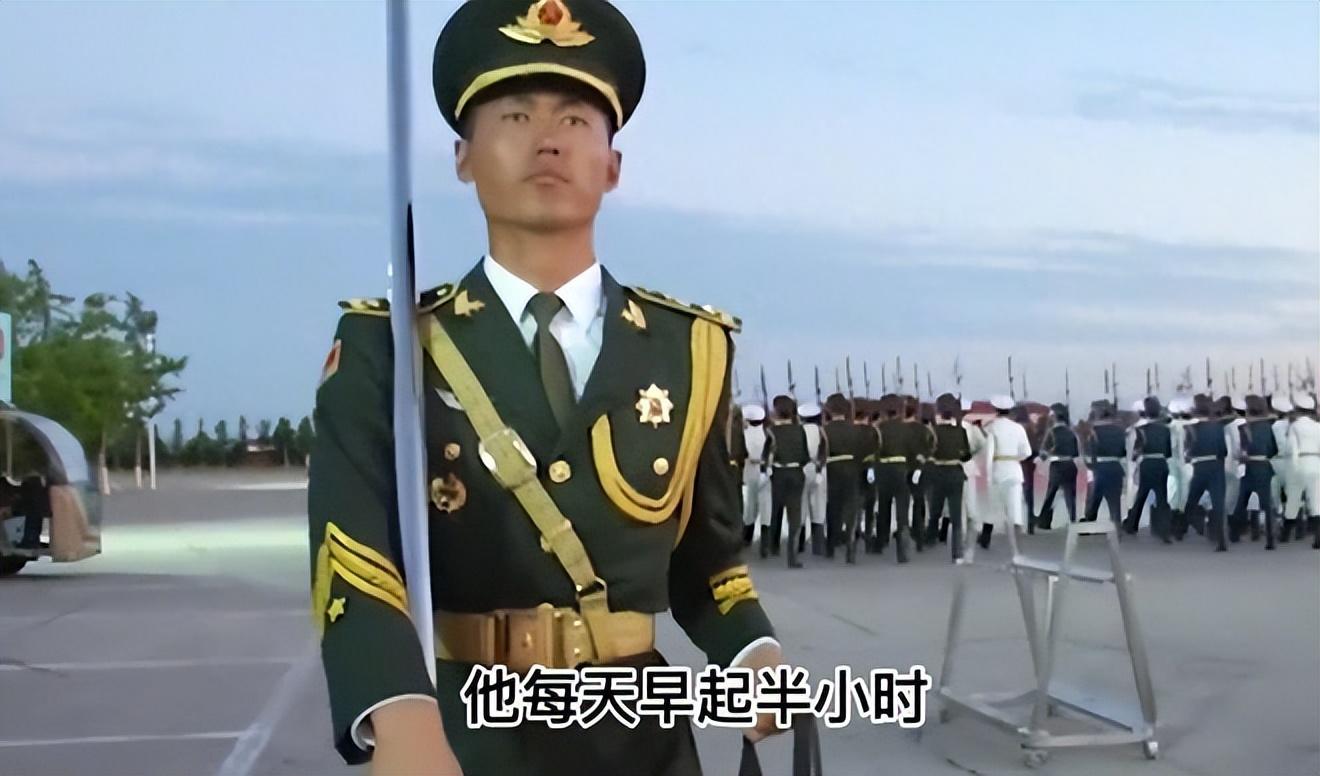 为了将旗杆和自己融合在一起,他在训练时,在30斤的旗杆上还会加上5斤重的大水壶踢5公里的正步。
