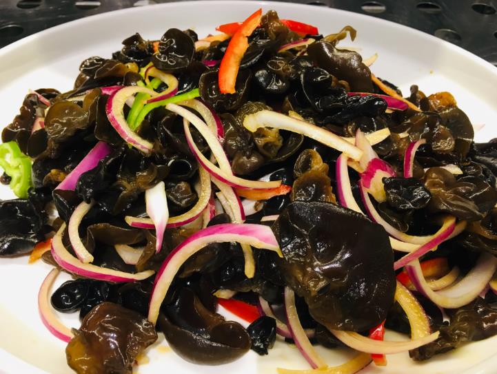 食材:木耳、洋葱、红椒、香菜、生抽、食盐、香油、香醋、白糖。