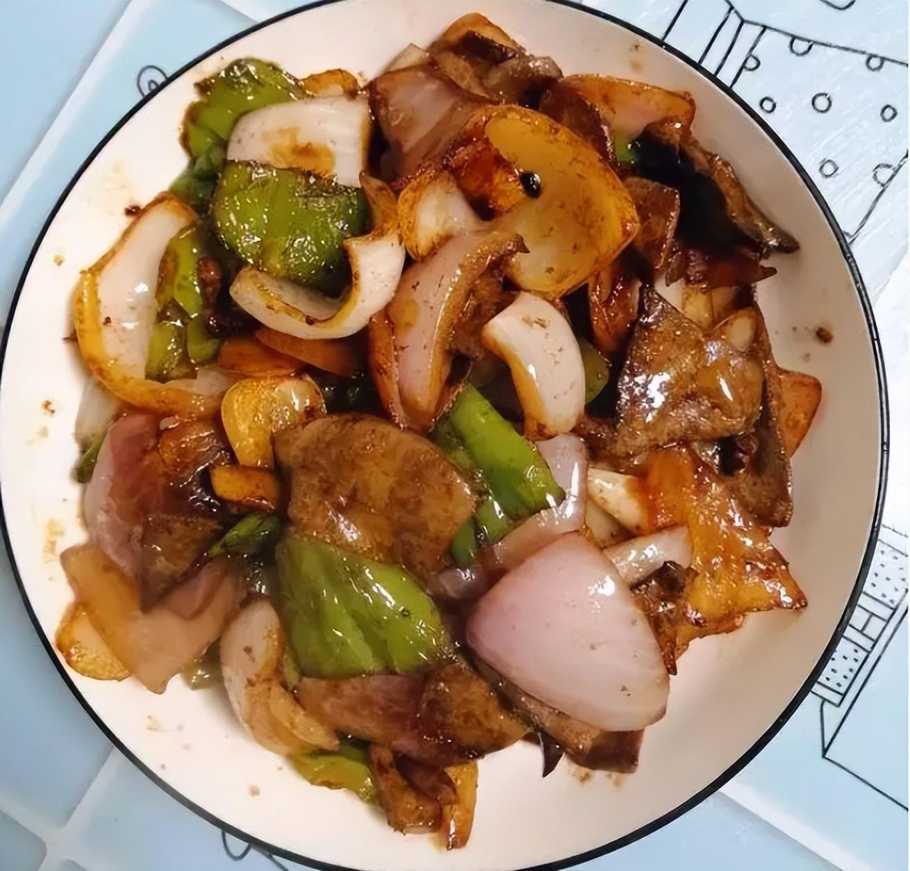 食材:青椒 1个、猪肝 650克、料酒 少许、老抽 适量、白砂糖 适量、生粉 适量、盐 少许、花生油 适量、香醋 少许、生姜 两片、生抽 适量、胡椒粉 适量、洋葱 1个。