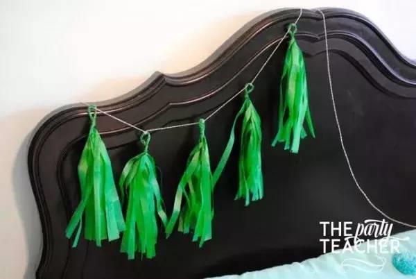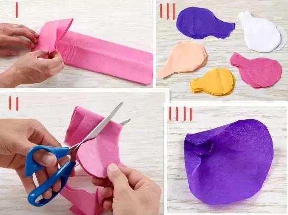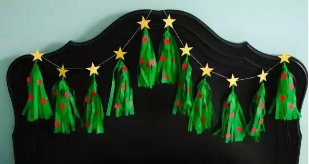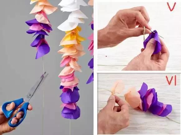 吊起来的花串,比如下图的样式,能给天花板增色不少。用柔软的皱纹纸,方便孩子穿针,老师不防带孩子们试一试。