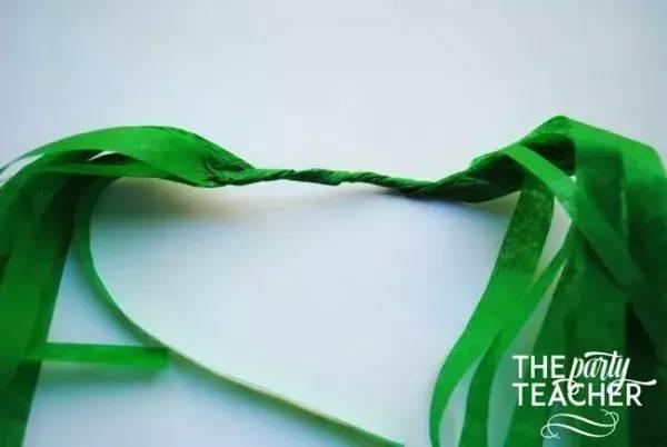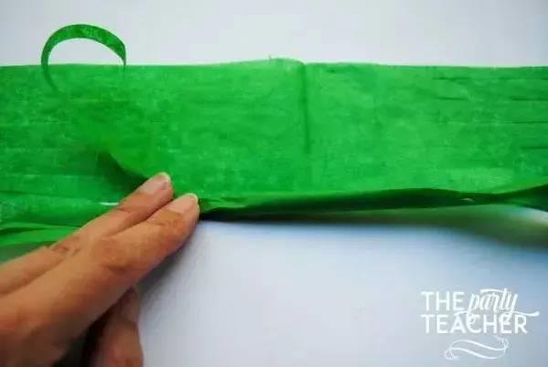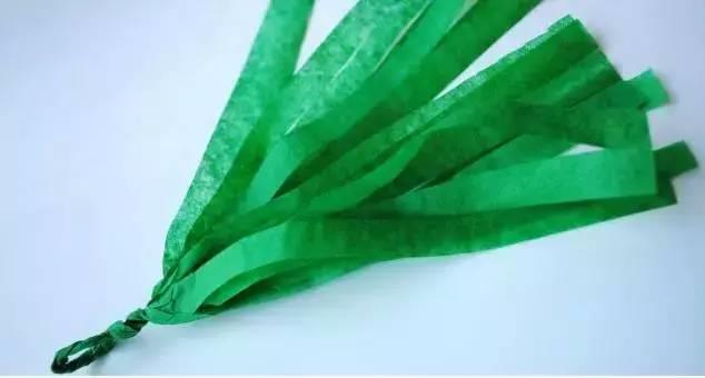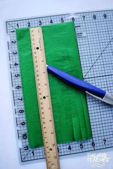 用直尺做测量,在绿色的皱纹纸上划出相同宽度的纸条,拿来当做穗子。