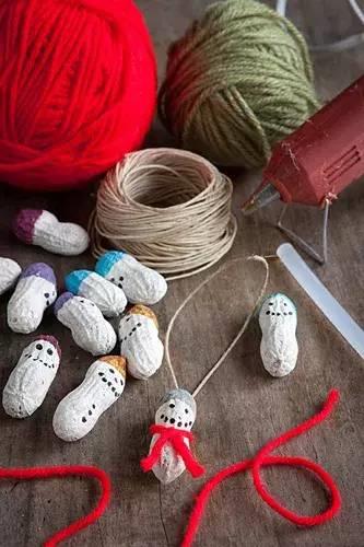 首先选出一些花生,并用颜料上色,可以给它们画一个白白的身体,不同颜色的帽子,黑色的眼睛、嘴巴、衣扣等,然后把它们晾干。之后,剪下一小段毛线绳,系在花生小人的脖子上,给它们做一条围巾。