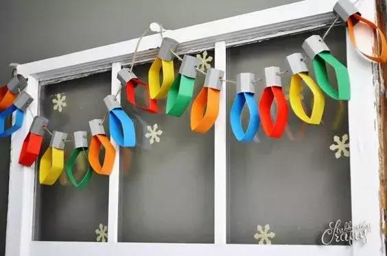 将纸条折两下,加个灰色纸条一串,立体小彩灯就完成了,超级好做,孩子们完全可以帮忙~