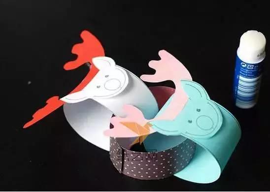 用彩纸剪出麋鹿头顶的角和麋鹿的脸,粘到纸环上面。