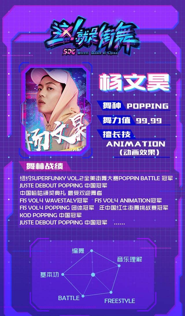 杨文昊是国内Wave,Animation风格的第一人,也是国内少有的任何风格都可以驾驭的全能popper,他也是有史以来第一位在美国取得poppin冠军的华人。简而言之,杨文昊可以说是是国内街舞界大神一般的存在,就连节目中以严格著称的韩庚,都要用“强大”这个词来形容他。