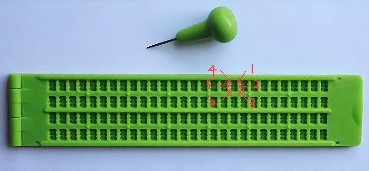我们以简写六点盲文为例,盲文的基本单位是 方,每个方有六个点组成,分左右两列,书写时从右往左,右侧一列为1 2 3点 左侧为4 5 6点,阅读时需要把纸张翻转,自然阅读顺序也就是从左往右,点位的排列顺序也就左右对调。通常书写盲文的工具为固定纸张的盲字版,和在纸上扎出凸点的盲字笔,一般采用牛皮纸书写。那么六个点的排列组合是怎么代表成千上万个汉字的呢。