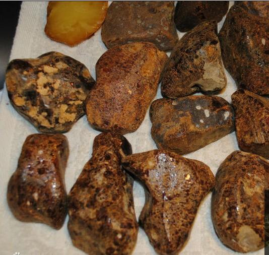 这种原石也是乌克兰的一大特色,数量还着实不少,而且强光手电很难打通透,焦皮下的肉质也不是一定,如三图所示就是一块金绞蜜,另外蜜蜡较多,金珀的可能性很少。不少人对于这类也是对敬而远之,和厚皮料一样,为了见着厚厚一层焦皮下的嫩肉,需要损耗不少精力和原料来打磨。额,怎么说呢,如果形状规整的话,还是不错的,虽然耗时耗力,但是皮下的成色也一般不会让人失望哦~裂的可能也是有的...因为手电照不进去,赌性也是不小啊。