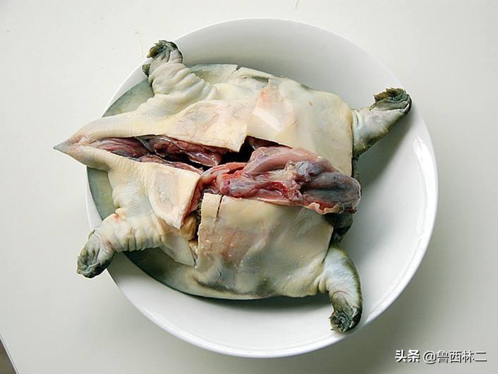 2、放凉后(迫不及待者可以用凉水浸泡降温)用剪刀或尖刀在甲鱼的腹部切开十字刀口,挖出内脏,宰下四肢和尾稍,关键得把腿边的黄油给拿掉。还要把甲鱼全身的乌黑污皮轻轻刮净.注意可别把裙边(也叫飞边,位于甲鱼周围,是甲鱼身上滋味最香美的部分)刮破或刮掉.刮净黑皮后,洗净.就算基本清理完工了.