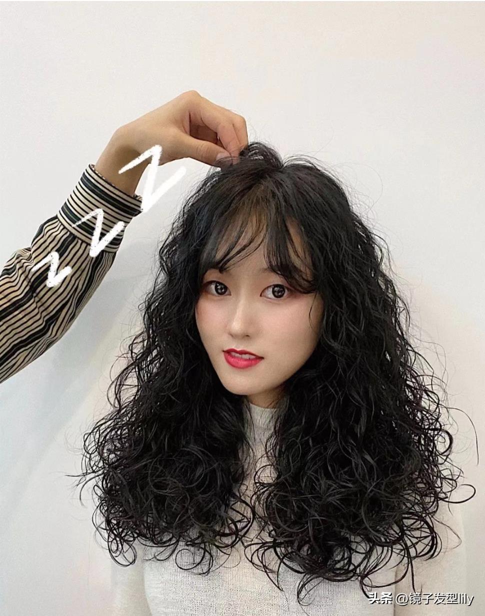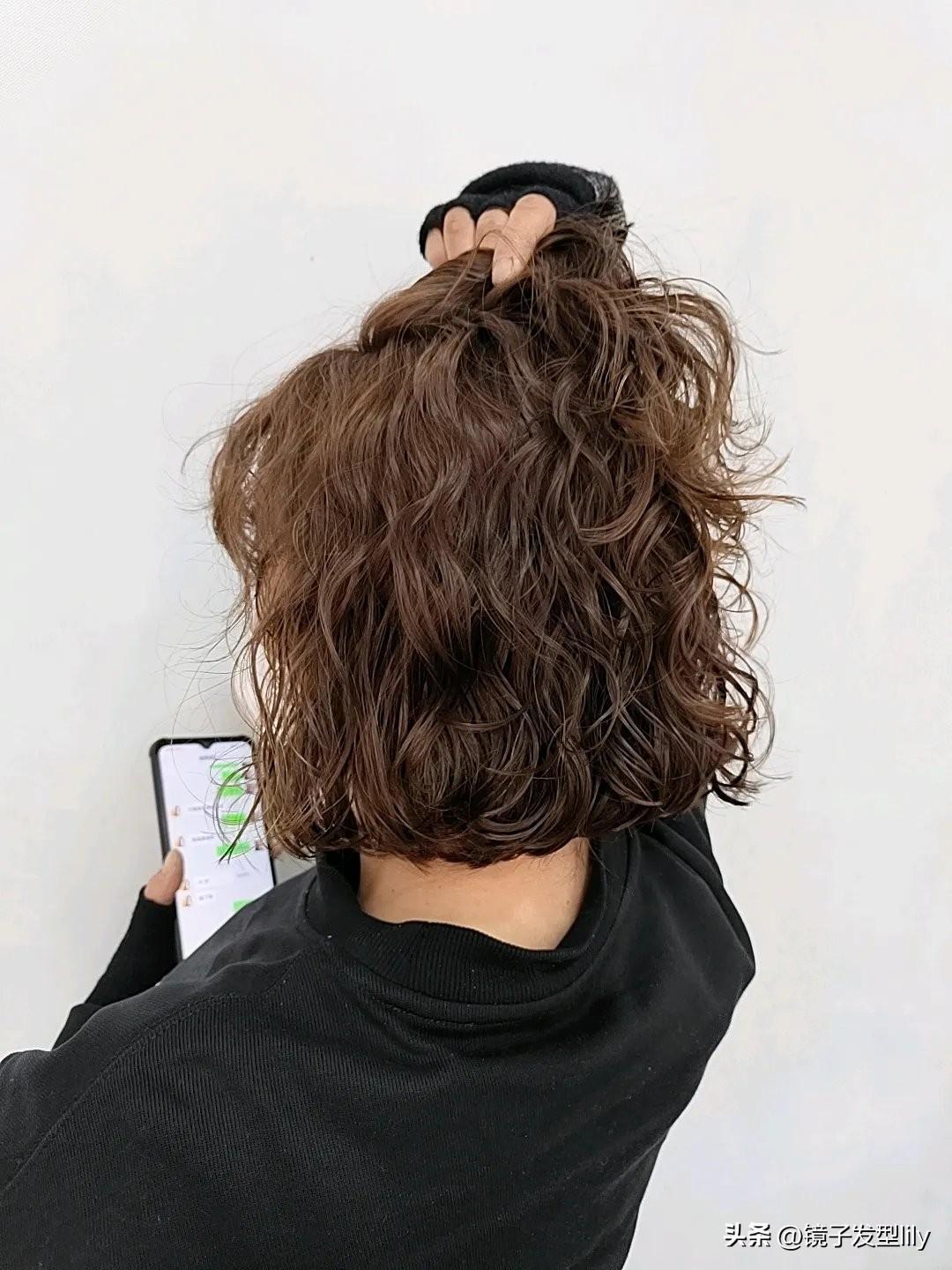 中小卷烫发,从发尾一直卷到发根,这样可以很好的增加整体的发量,蓬蓬的的造型,保持的时间也会更久一些。