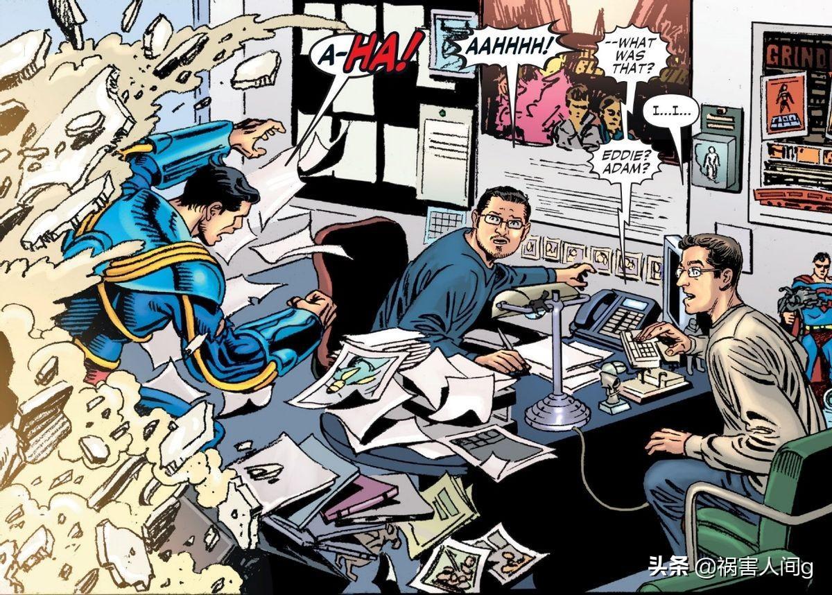 DC漫画中也发生过相似的事情,在2010年漫画《冒险漫画》V2#4中,至尊小超人正在自己家的地下室看漫画时,亚历山大卢瑟带领黑灯军团攻击了他,至尊小超人和黑灯军团战斗中闯入了DC编辑部,把DC编辑部砸的一片狼藉。