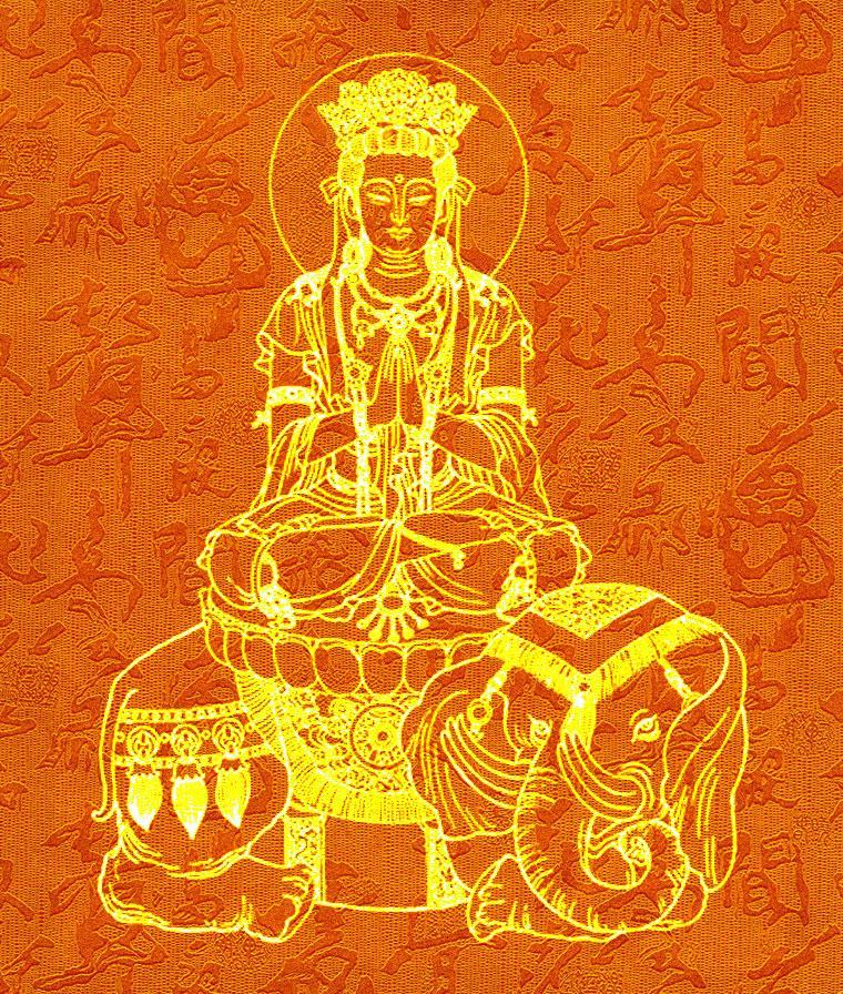 普贤菩萨:是行、愿弘深的典范。梵语的普贤称“三曼多拔陀罗”,密宗亦称普贤为善摄金刚、真如金刚、如意金刚。在雕像上,普贤乘白象侍佛之右;文殊驾狮子侍佛之左。