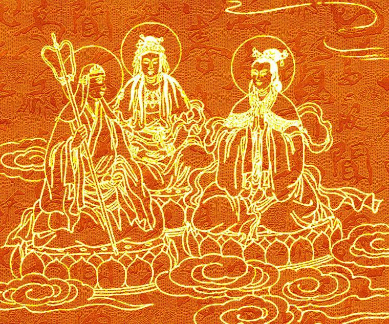 大势至菩萨:又称得大势菩萨或大精进菩萨,简称为势至。音译为“摩诃那钵”。据《悲华经》卷二称,删提岚世界的无诤念王有一千个儿子,长子名不眴,次子名尼摩。后无诤念王成佛为阿弥陀如来,不眴太子为观世音菩萨。而尼摩太子则成了大势至菩萨 菩萨跟随佛学法修菩萨行,经过许多阶段之后,才可成佛。