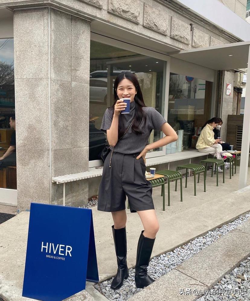 再加上一双黑色的长靴,就会把重点从只有胯转移到下半身的整体,all black的法则完美演绎长腿特效。