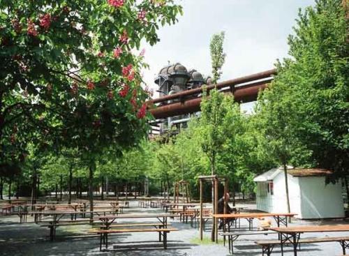 杜伊斯堡景观公园原为著名的蒂森钢铁公司所在地,是一个集采煤、炼焦、钢铁于—身的大型工业基地,1985年停产后被改造为一个以煤铁工业为背景的大型景观公园。昔日的厂区如今变成男女老少聚集的溜冰场,而原来存放炼钢焦煤的巨大水泥构筑物,现在被改造成了一个攀岩训练场,水泥岩壁上增设了适合不同水平的攀岩者路径,吸引了各种年龄的攀岩爱好者。因为这个场地的设立,在没有一座山的鲁尔工业区,德国攀岩协会的鲁尔分会竟然拥有了全国最多的会员。
