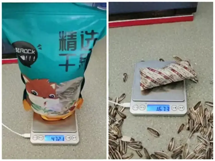这个事件并非个例。在今年8月,一位活跃在某短视频平台的测评博主也曾测试了两包相同包装的瓜子,结果同样让人大跌眼镜,两包瓜子的重量分别为472.4克和475.5克,而干燥剂的重量分别是61.3克和63克。这显然不是偶然现象,而是一个普遍存在的问题。