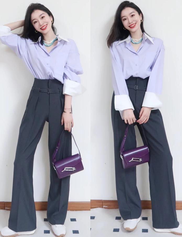 上身搭配香芋紫色衬衫,灰色配紫色,真的是高级范十足,对不对?记得要把衬衫塞进裤子里面,这样才能轻松打造出大长腿和高挑感。