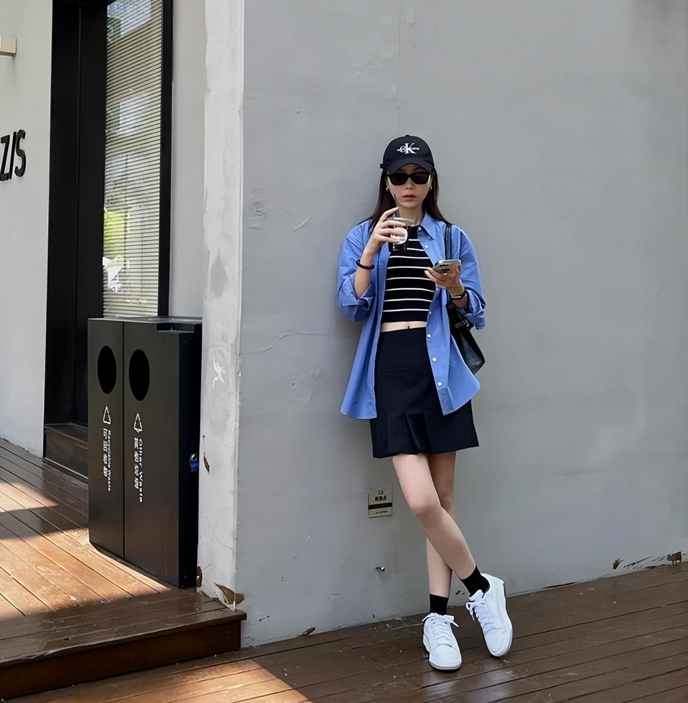 谁说小白鞋过时了呢?像这么一双白色运动鞋,真的是超级百搭耐看和经典的,对不对?属于完全不挑人的款式,怎么搭配都好看!蓝色衬衫+黑白条纹短t,这样的穿法组合,真的是休闲又时髦,而且,对于小个子女生来说也是很赞的,轻松提高腰线比例。