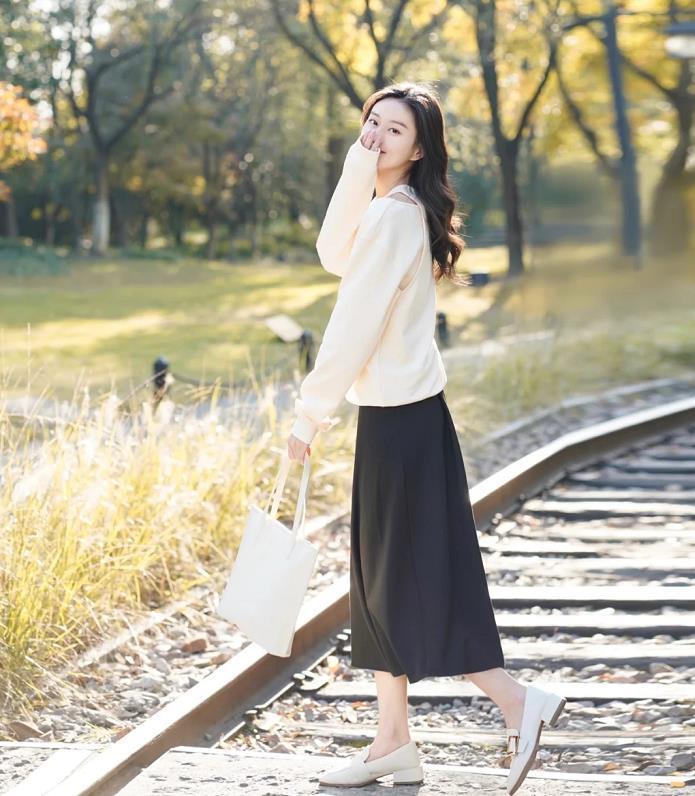落落大方的一套,春季这么穿整个人都显得很气质哟~白色小粗跟乐福鞋,这种鞋子就是专属于春季的,无论你选择什么衣服来配,基本都是可以的。黑色半身长裙+杏色的上衣,这么一套配色看起来实在是太温柔了,对吧?