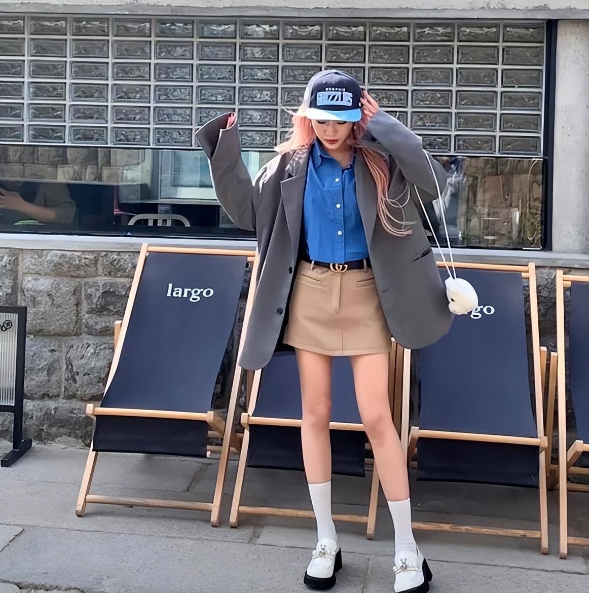 厚底粗跟设计的白色乐福鞋,这对于小个子女生来说,可是很友好的,穿起来可显腿长了,更何况搭配了短裙,灰色西装外套+蓝色衬衫,这样的穿搭就是气质范十足!