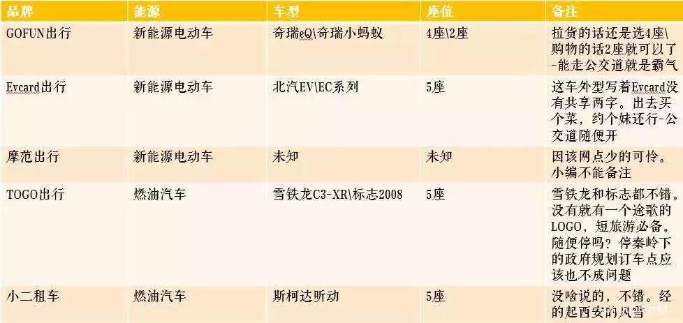 目前在西安已经有了以下几种出行汽车共大家选择。