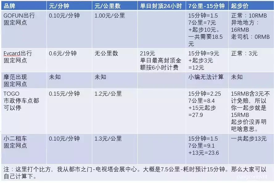 好了,看完了网点的多少,让我们看看这些商家都提供了那些车型,车型其实对我们使用者来说没有什么可选的。商家提供什么我们只能选择什么。一张表告诉你区别: