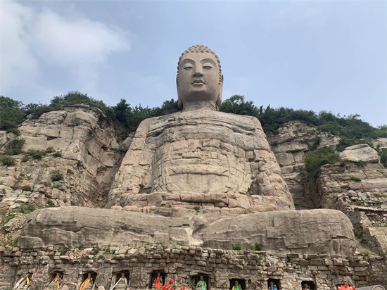 蒙山大佛,又名西山大佛,中国北朝时期体量最大的摩崖大佛和佛阁,是世界上有确切纪年,开凿年代最早,体态最大的巨型摩崖石刻释迦牟尼佛像,距今已有一千五百年的历史,比乐山大佛还要早出一百六二年,通体高六十三米,依山镌刻,结跏跌足而坐,双手施禅定印,佛体厚胛肥肩,佛超山峦,高遏云天,气势非凡