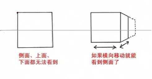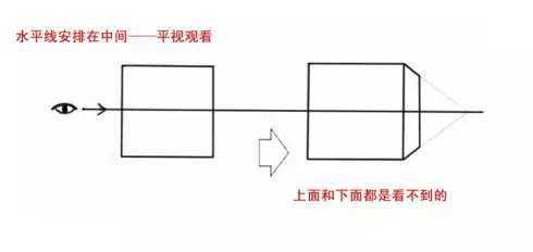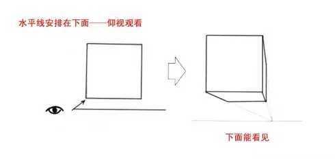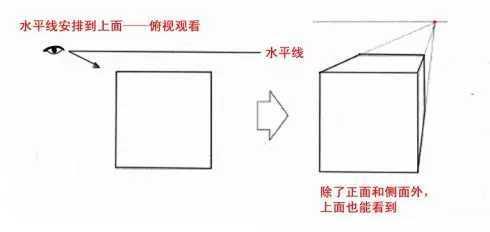 水平线的高低是随眼睛的上下移动的变化而变化的,它决定了方盒子的上面或者下面能看到多少。 水平线在上(俯视)