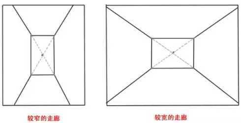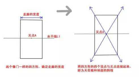 (1)确定长廊的宽度,绘制天花板的斜线和地面的斜线(下图蓝色斜线)