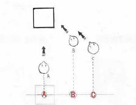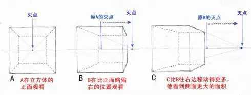 下图显示观者分别站在A、B、C三点时,看到的侧面的宽窄不同