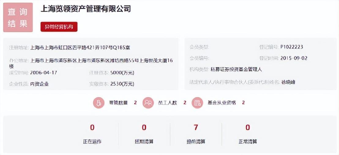 上海览领资产管理有限公司在基金业协会备案的私募产品合计7只,包括览领价值成长、览领滁州大牛、览领晓峰对冲基金一号、览领晓峰宏观策略新格局、览领上海徐晓峰等均已被清算。
