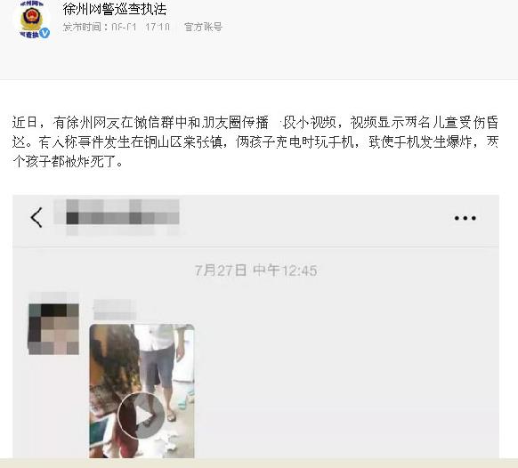 从7月26日至8月2日,全国各地警方都在辟谣。记者查询发现,8月1日,徐州警方“徐州网警巡查执法”就公开辟谣:“徐州网传手机充电爆炸,炸到两孩童?是谣言!”