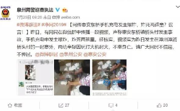 各地流传的版本,大多是把地区改成了当地,河南、山东等地也是有传播,迷惑性很强,手机充电电池爆炸引发不少网友恐慌。事实上,早在7月26日,福建事发当地就曾辟谣:“漳浦县旧镇镇桥头村发生一起两名儿童死亡事件,疑因玩打火机引发,事件原因正在调查中。”