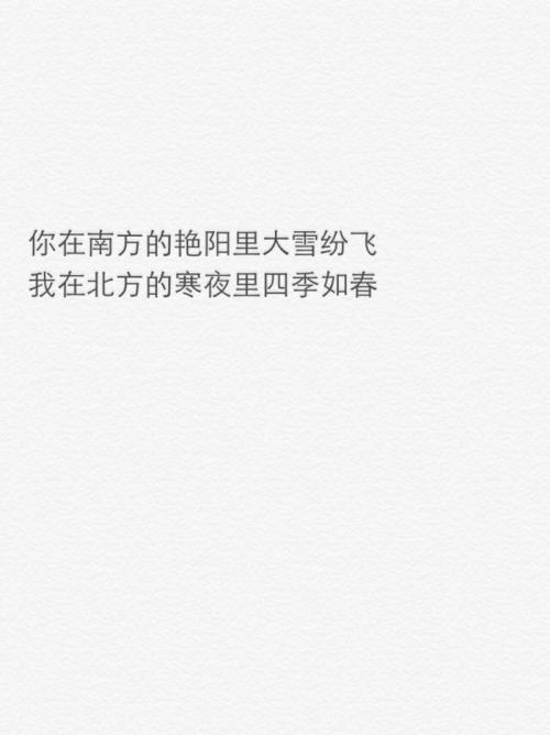 故事讲的是女主深圳。 男孩在北京。 一在天之涯,一在海之角。 一云隆冬日,一曰是春晓。 万里的相恋。 所以从一开始,歌词就写出了这种状况: 你在南方的艳阳里大雪纷飞 我在北方的寒夜里四季如春? 但是不是的。 故事里的女孩,一直以为男孩子抛弃了她,以为男方出了轨,心已完全凉了。而男孩,因为一些原因,不得不和女孩子分手。和女孩不同的是,男孩知道她是爱他的。所以,虽在北方,心里头却还充满了温存。