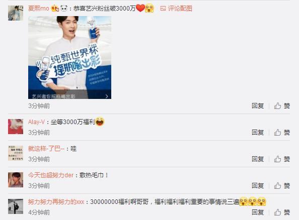 张艺兴微博粉丝突破3000万,评论区炸了,粉丝喊话:坐等福利!