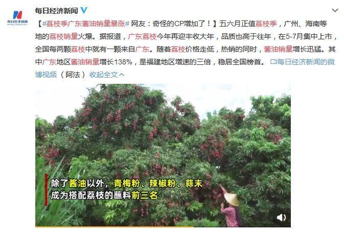 天猫超市调查发现,从5月底开始,广东地区酱油销量增长了138%,是同样是吃荔枝大省的福建地区的三倍,居全国榜首。