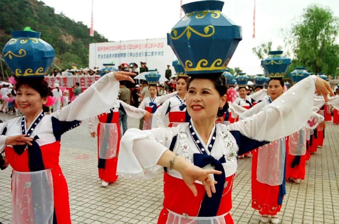 吉林省吉林市举行第二届朝鲜族端午民俗艺术节,数万名朝鲜族群众载歌载舞。这是《顶水舞》表演(2002年6月15日)。徐英宏摄(新华社发)